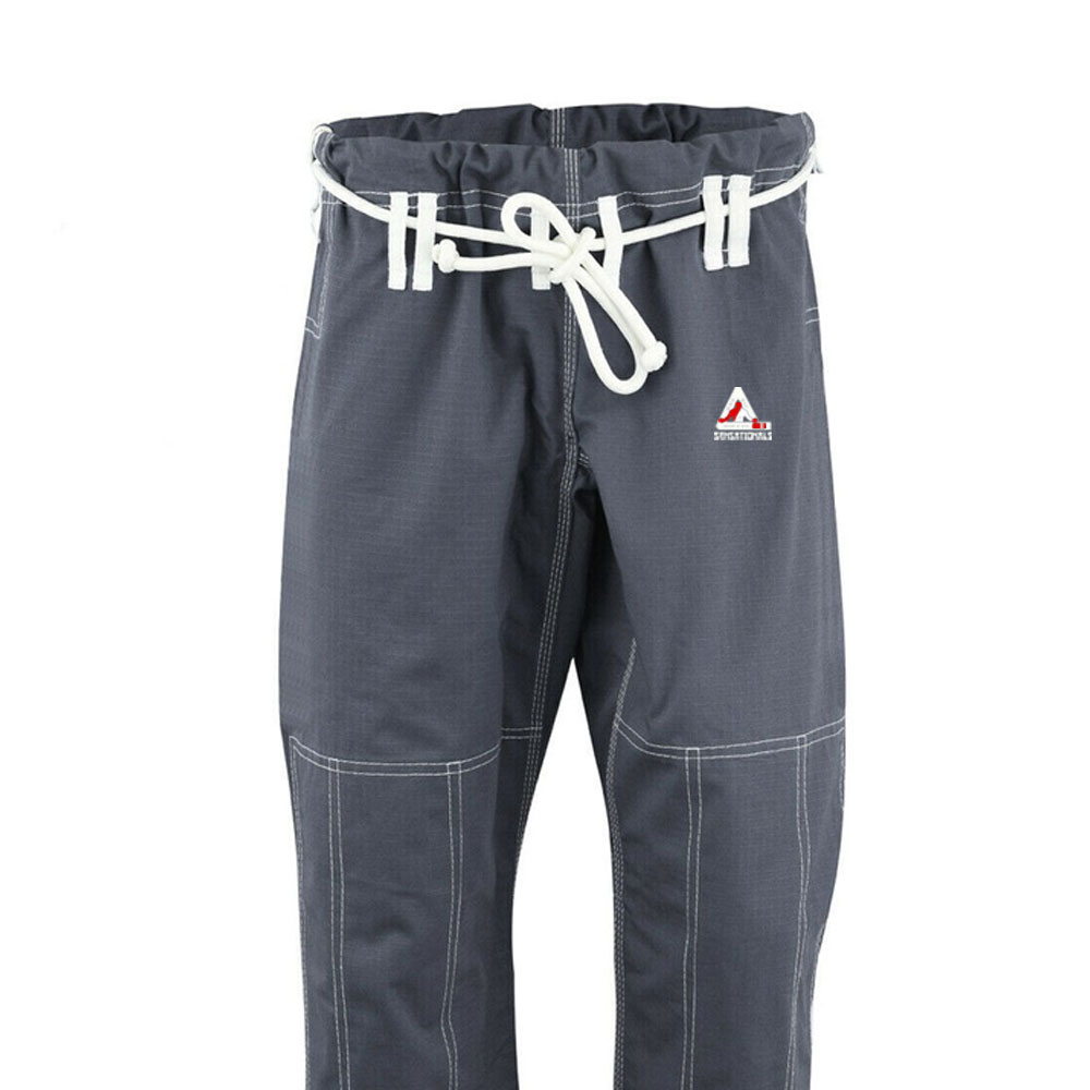 BJJ pants are sturdy, reinforced cotton or ripstop fabric trousers designed for maximum mobility and durability during grappling training and competition, featuring drawstrings for secure fit and reinforced knees and seams to withstand intense activity. They are a key part of the BJJ gi uniform, providing necessary protection and allowing practitioners to focus on technique without restriction.Â