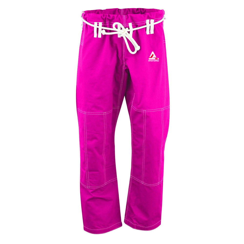 BJJ pants are sturdy, reinforced cotton or ripstop fabric trousers designed for maximum mobility and durability during grappling training and competition, featuring drawstrings for secure fit and reinforced knees and seams to withstand intense activity. They are a key part of the BJJ gi uniform, providing necessary protection and allowing practitioners to focus on technique without restriction.Â
